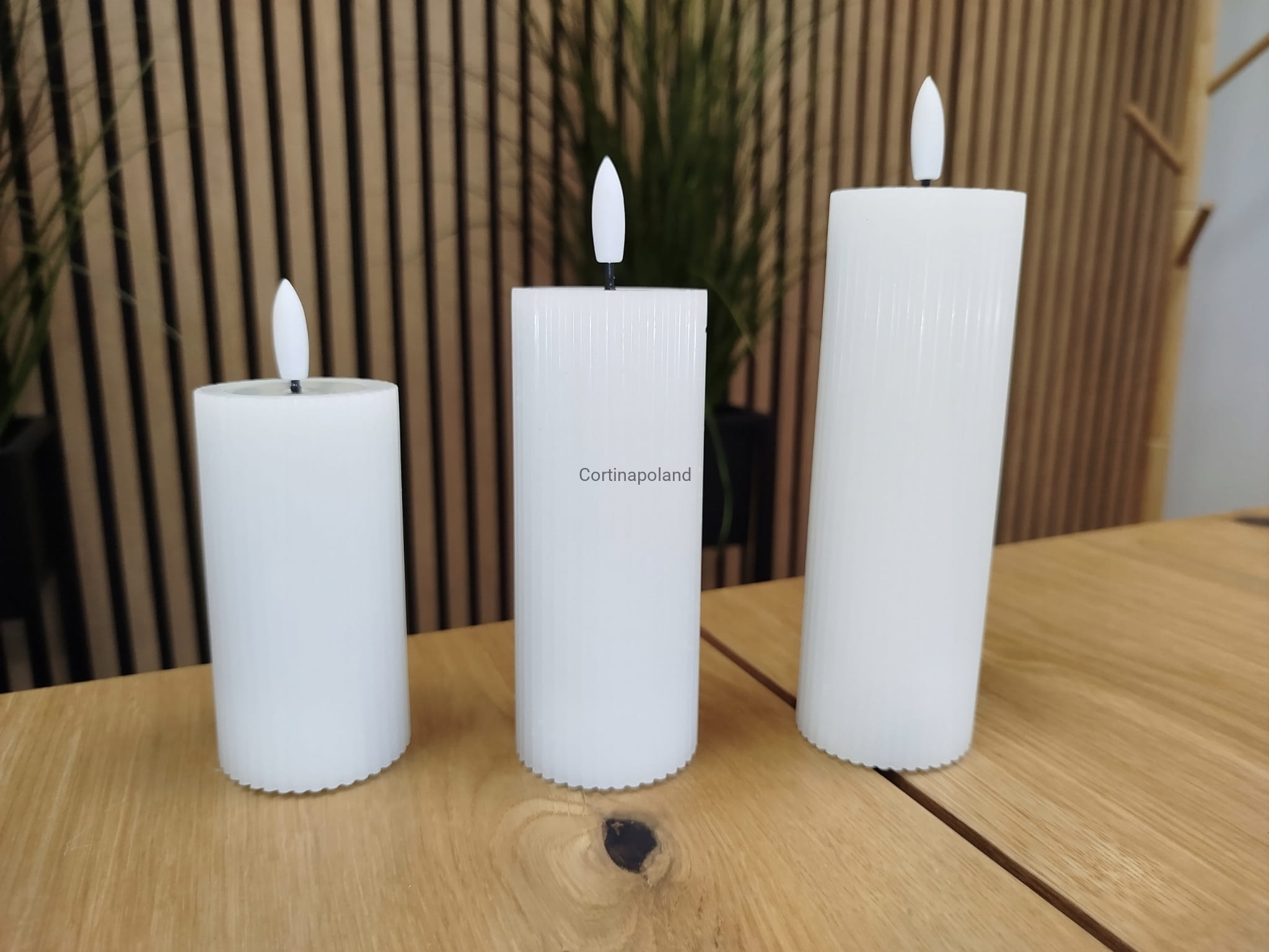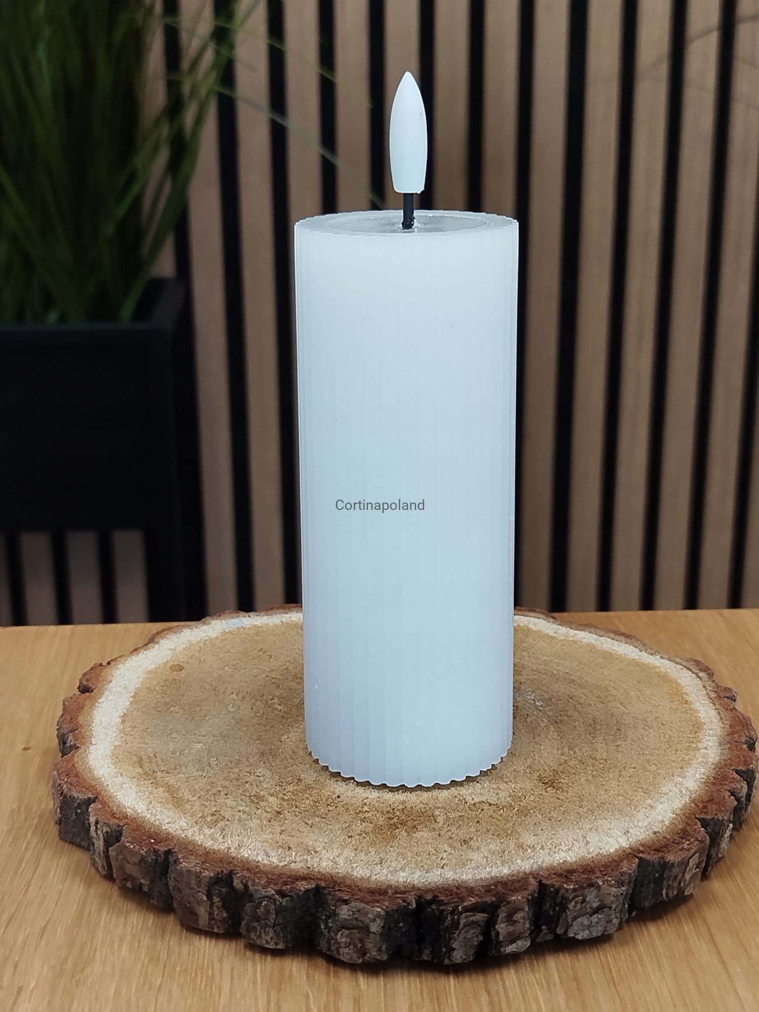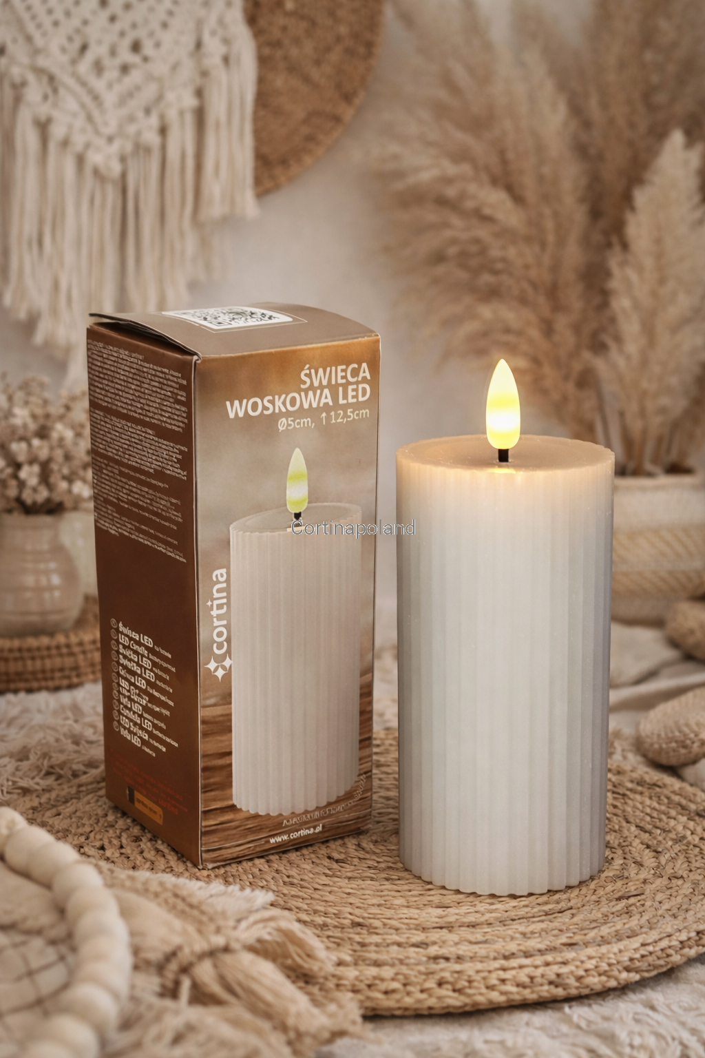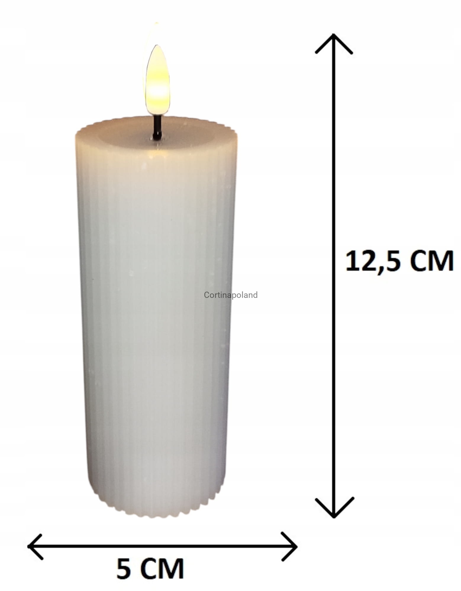 Biała świeca woskowa LED karbowana z efektem płomienia na baterie 12,5 cm x 5 cm