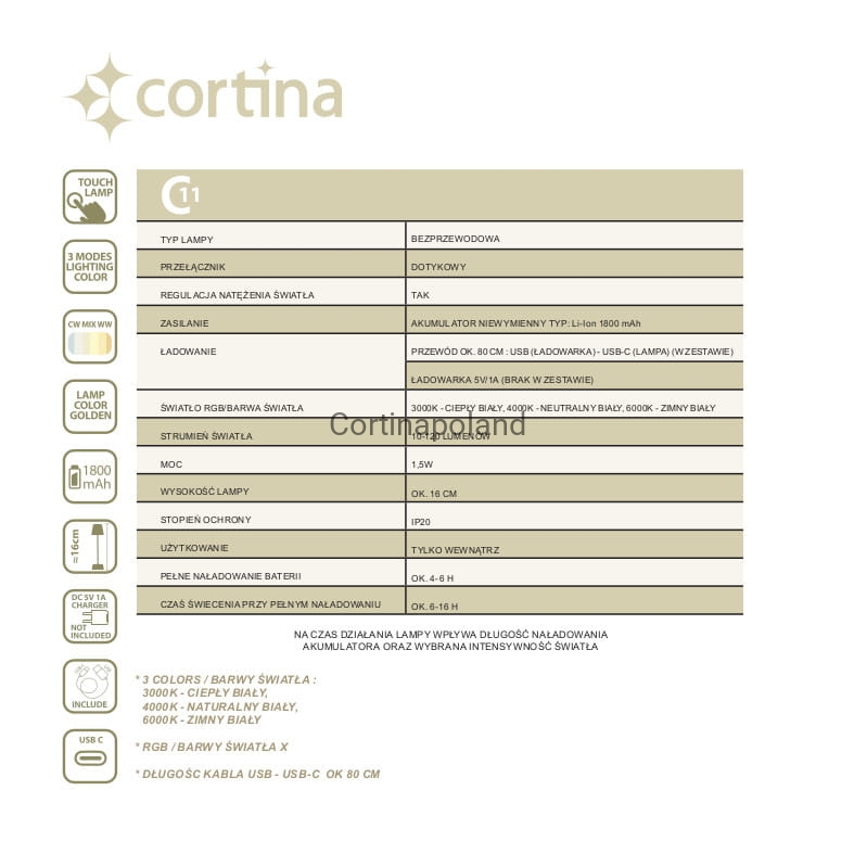 - Ładowanie przez USB-C: Lampa jest wyposażona w port USB-C, co pozwala na szybkie i wygodne ładowanie.